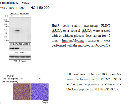 PLIN2 (Phospho-Ser159 )antibody detects endogenous levels of PLIN2 only when phospholated at serine159 . |